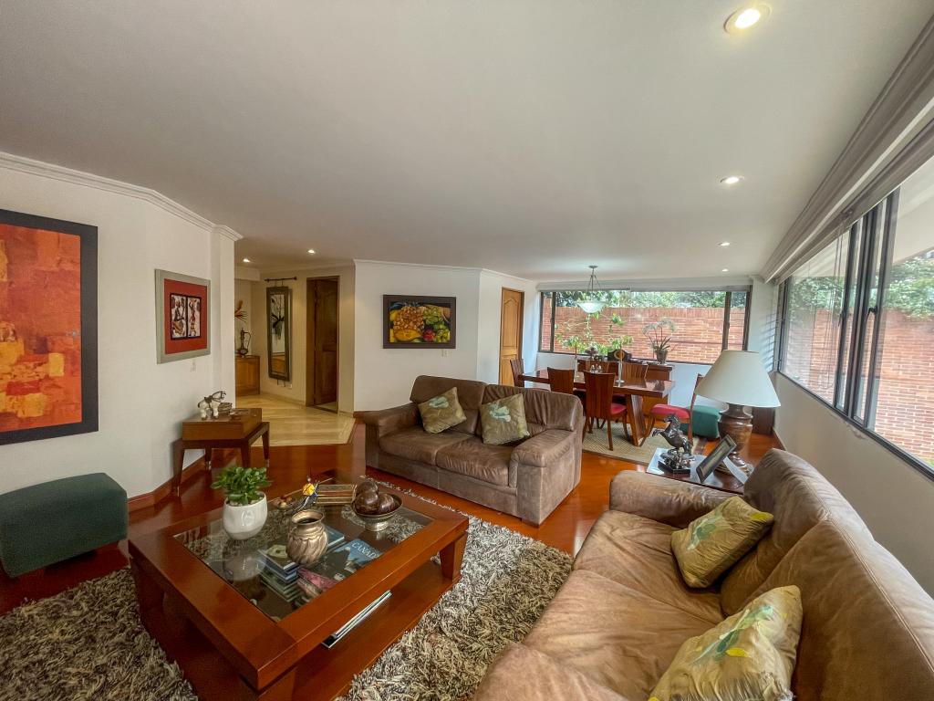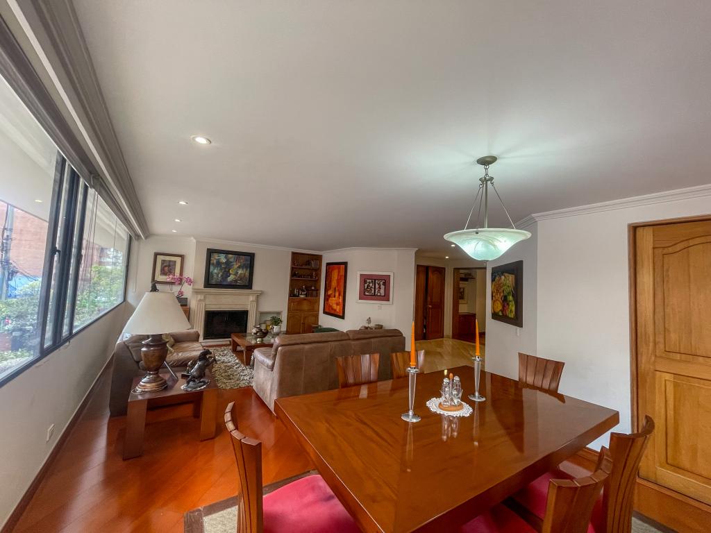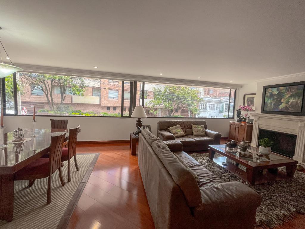 Amplio apartamento, segundo piso con ascensor, vista exterior, sala con chimenea tradicional, baño social, cocina cerrada amplia con isla, cuarto y baño del servicio, hall de alcobas, 3 alcobas dos de ellas con baño privado, estar de TV, altura de 2.25, mts, 3 garajes cubiertos independientes, depósito, edificio con gimnasio, sauna, salón comunal, shut de basura, cerca a colegio Gimnasio moderno, quebrada la vieja, excelentes vías de acceso por la carrera séptima, calle setenta y dos, carrera primera y calle setenta y cuatro.